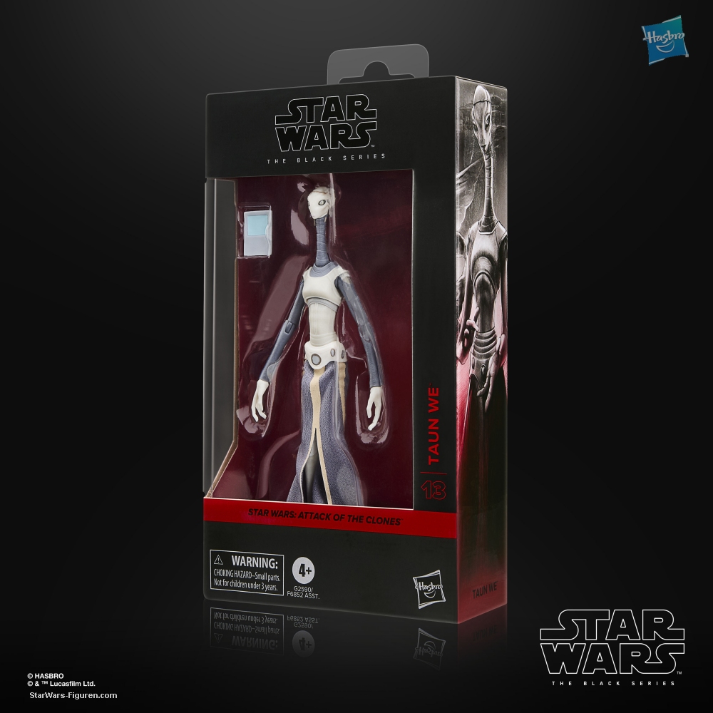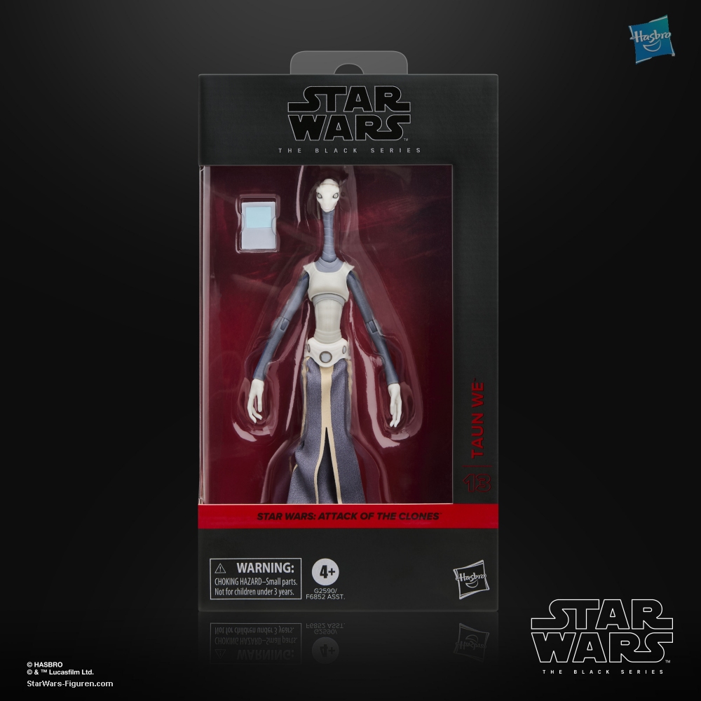 A beautiful sylph-like Kaminoan, Taun We is the administrative aide to the Prime Minister of Kamino. She naively introduced Obi-Wan Kenobi to the original source of the Kamino clones, Jango Fett. STAR WARS: THE BLACK SERIES includes 6-inch action figures, vehicles, and roleplay items from the 40-plus-year legacy of the STAR WARS galaxy, letting fans create galactic scenes with a faithfulness to STAR WARS comic books, movies, series, and more. This STAR WARS Hasbro action figure is detailed to look like Taun We from STAR WARS: ATTACK OF THE CLONES. With exquisite features and decoration, THE BLACK SERIES embodies the quality and realism that STAR WARS devotees love (additional products each sold separately, subject to availability).