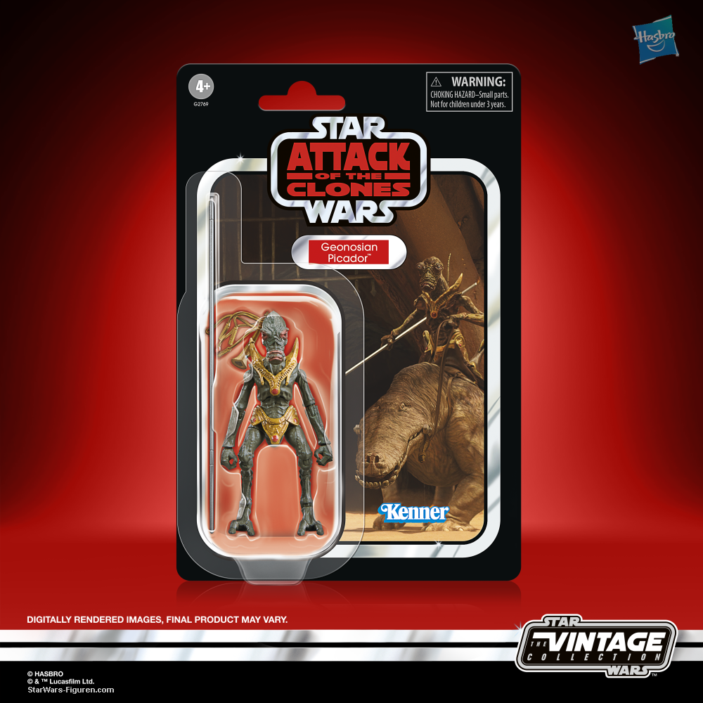 Geonosians use orrays, creatures native to the rocky planet, as mounts for the picadors in the execution arena. Celebrate the legacy of STAR WARS with premium vehicles, playsets, and action figures from STAR WARS: THE VINTAGE COLLECTION. Based on an orray and a Geonosian Picador as seen in STAR WARS: ATTACK OF THE CLONES, this 3.75-inch- scale figure set makes a great addition to any fan’s collection. Inspired by the original line, these collectibles feature premium detail and design across product and packaging, and collector-grade deco that fans have come to know and love. The included arena cart comes with attachable reins for the orray’s saddle, and the Geonosian Picador can be posed on the cart. Calling back to the original 1970s and 1980s vintage toys, the Geonosian 3.75 inch action figure features Kenner branding and package design with a unique VC number for collectability. Find other STAR WARS collectibles from THE VINTAGE COLLECTION to reimagine iconic scenes -- or create your own (each sold separately, subject to availability).