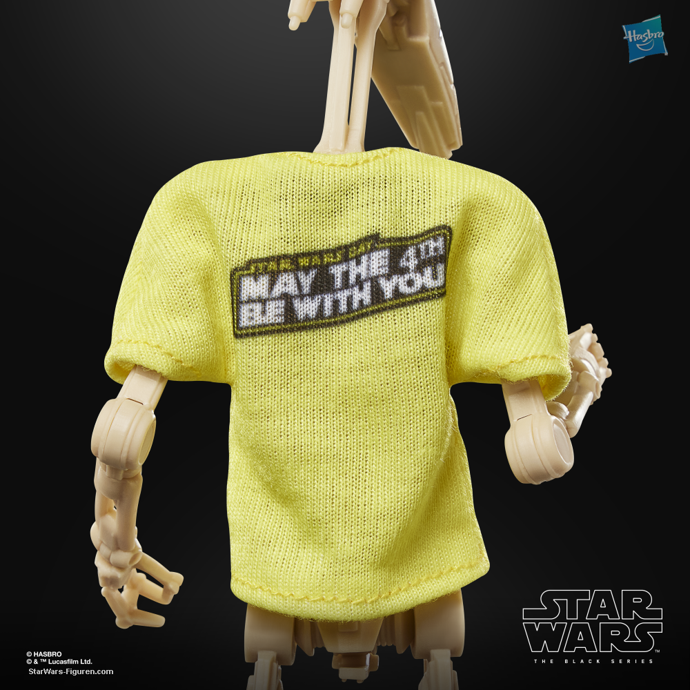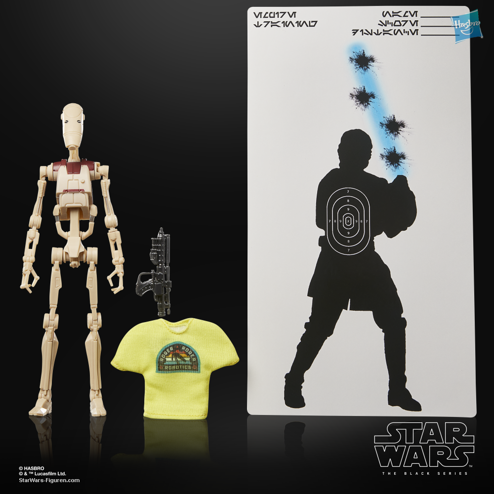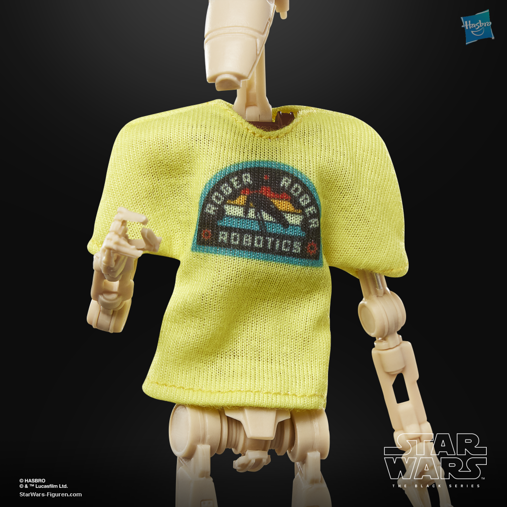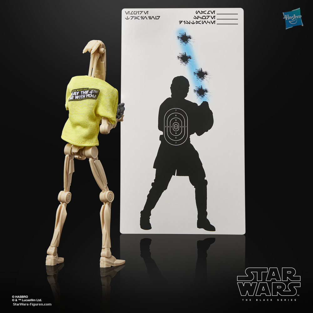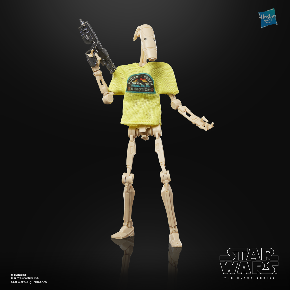 STAR WARS: THE BLACK SERIES includes 6-inch action figures, vehicles, and roleplay items from the 40-plus-year legacy of the STAR WARS galaxy, letting fans create galactic scenes with a faithfulness to STAR WARS comic books, movies, series, and more. This STAR WARS Hasbro action figure is detailed to look like a battle droid with a playful twist for fans! Celebrate May the 4th by embracing the fun side of the Force with this special edition figure from THE BLACK SERIES -- a great gift for collectors and fans ages 4 and up. This 6-inch-scale figure features premium design and deco, multiple articulation points, and a soft goods “Roger Roger Robotics” t-shirt. Pose out your figure with the included blaster accessory and the “target practice” poster of the legendary Jedi Anakin Skywalker. Window box packaging features the classic black and yellow color scheme and a “5.04” collector number. With exquisite features and decoration, THE BLACK SERIES embodies the quality and realism that STAR WARS devotees love (each sold separately, subject to availability).