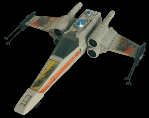 1982 So - endlich war er da - der erste X-Wing der nun auch optisch dem "used-look" des Star Wars Universums gerecht wurde. Da dies damals (der Tampondruck war noch nicht erfunden) maschinell nicht möglich war legte man kurzerhand einen Aufkleberbogen mit bei - und zack - fertig ist die abgerockte Kampfmaschine. Die US Version ist darüber hinaus in grau modelliert, hat aber immer noch Sound und modelliertes Heck, jedoch keine Birne mehr