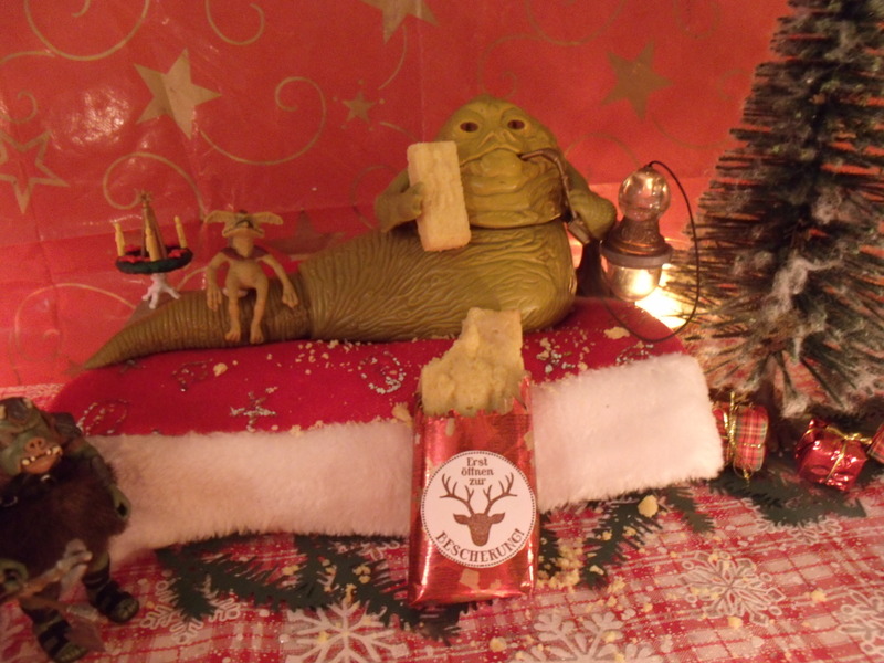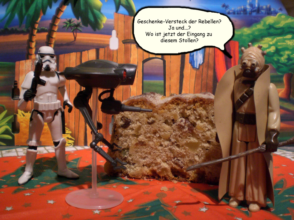 For our English reader's: Stollen (the pastry) and Stollen (mine tunnel/gallery) is the same word in German! So the Tusken says to the Search-Droid: "A hideout for presents from the Rebels? And? Where's the entrance?"